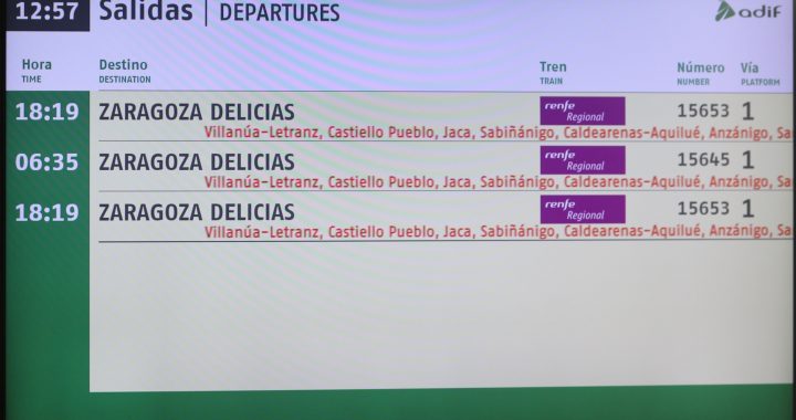 Ce chiffre fourni par la RENFE ne comptabilise que les voyageurs qui sont montés et descendus dans les gares d’Ayerbe, Riglos, Santa María et La Peña, Anzanigo, Caldearenas-Aquilué, Sabiñánigo, Jaca, Castiello-Pueblo, Villanúa et Canfranc. Ceux qui ont fait le trajet entre Huesca et Saragosse ne sont pas comptés.